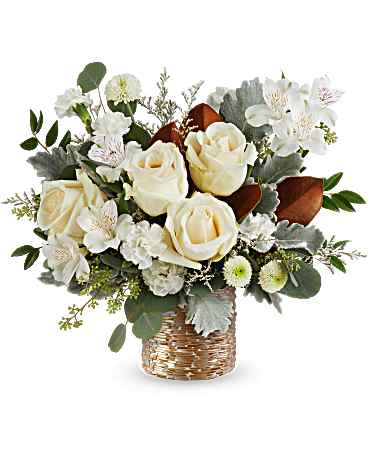 The Golden Mod Bouquet shines with crème roses, white alstroemeria, and carnations surrounded by magnolia leaves, dusty miller, and eucalyptus. Designed in Teleflora's Chic Copper Mosaic vase, this radiant mix brings modern elegance and golden warmth to any celebration.