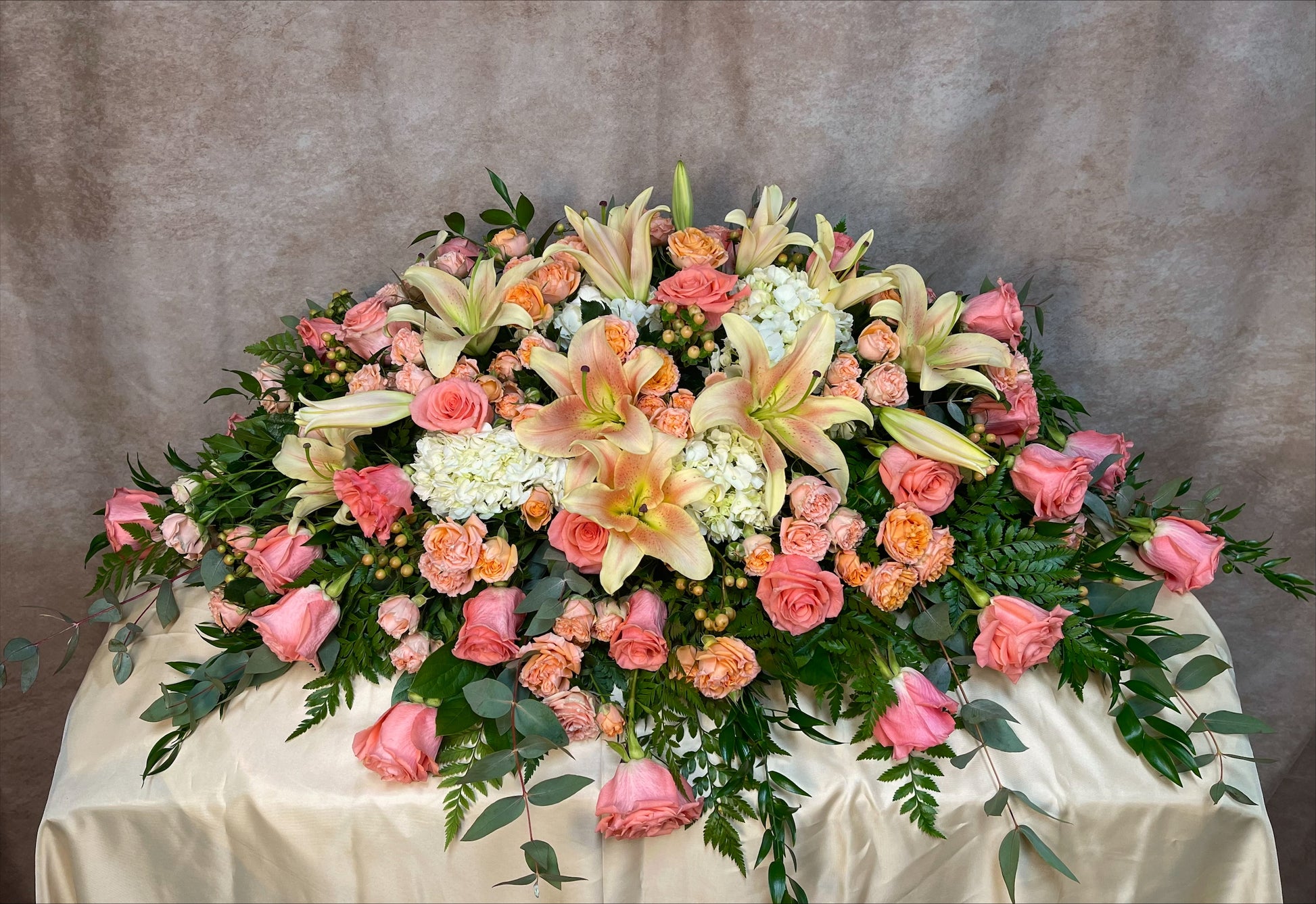Vibrant shades of coral and peach illustrate the light of a new day’s sunrise. This glowing tribute honors the love shared by those we miss the most.