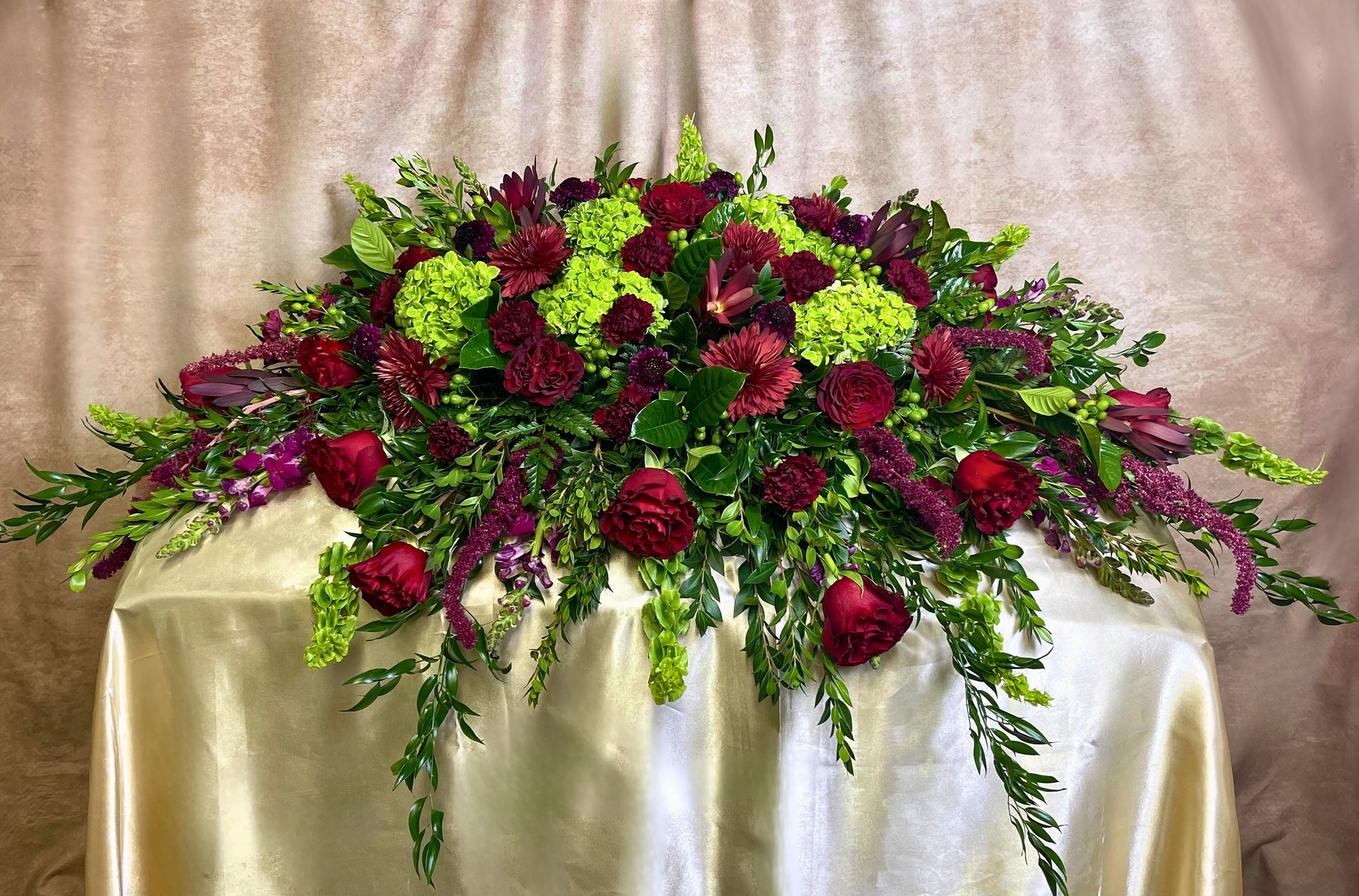 An elegant composition of burgundy blooms and green foliage, echoing the quiet grace of the earth beneath an overcast sky. Featuring distinctive flowers such as scabiosa, safari sunset, and bells of Ireland, this arrangement offers a peaceful reflection on a life beautifully lived.